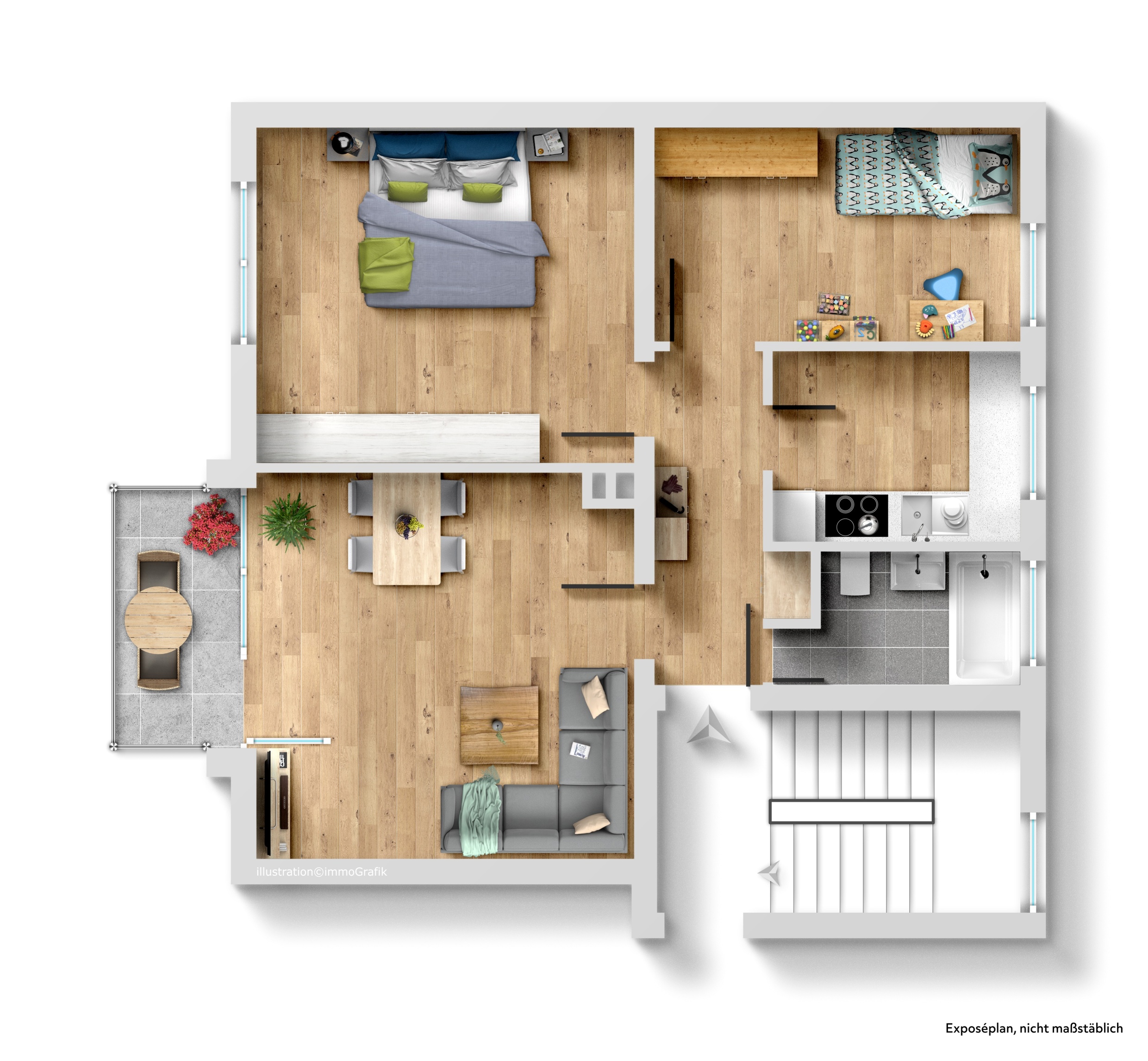 Mit einem durchdachten Grundriss überzeugt die Immobilie durch ihr Potenzial und ihre vielseitigen Gestaltungsmöglichkeiten. Das helle Wohnzimmer bildet den Mittelpunkt der Wohnung und bietet direkten Zugang zum Balkon, der zusätzlichen Wohnkomfort schafft und zu entspannten Stunden im Freien einlädt.